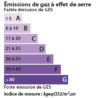 - et une étiquette "climat" précisant l'impact par an de cette consommation énergétique sur les émissions de gaz à effet de serre CO2 sur une graduation allant de A (émission faible, inférieure à 6 kilos d'équivalent carbone/m²) à G (émission importante, supérieure à 80 kilos d'équivalent carbone/m²).